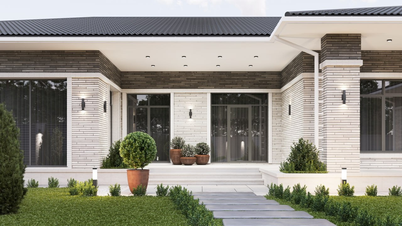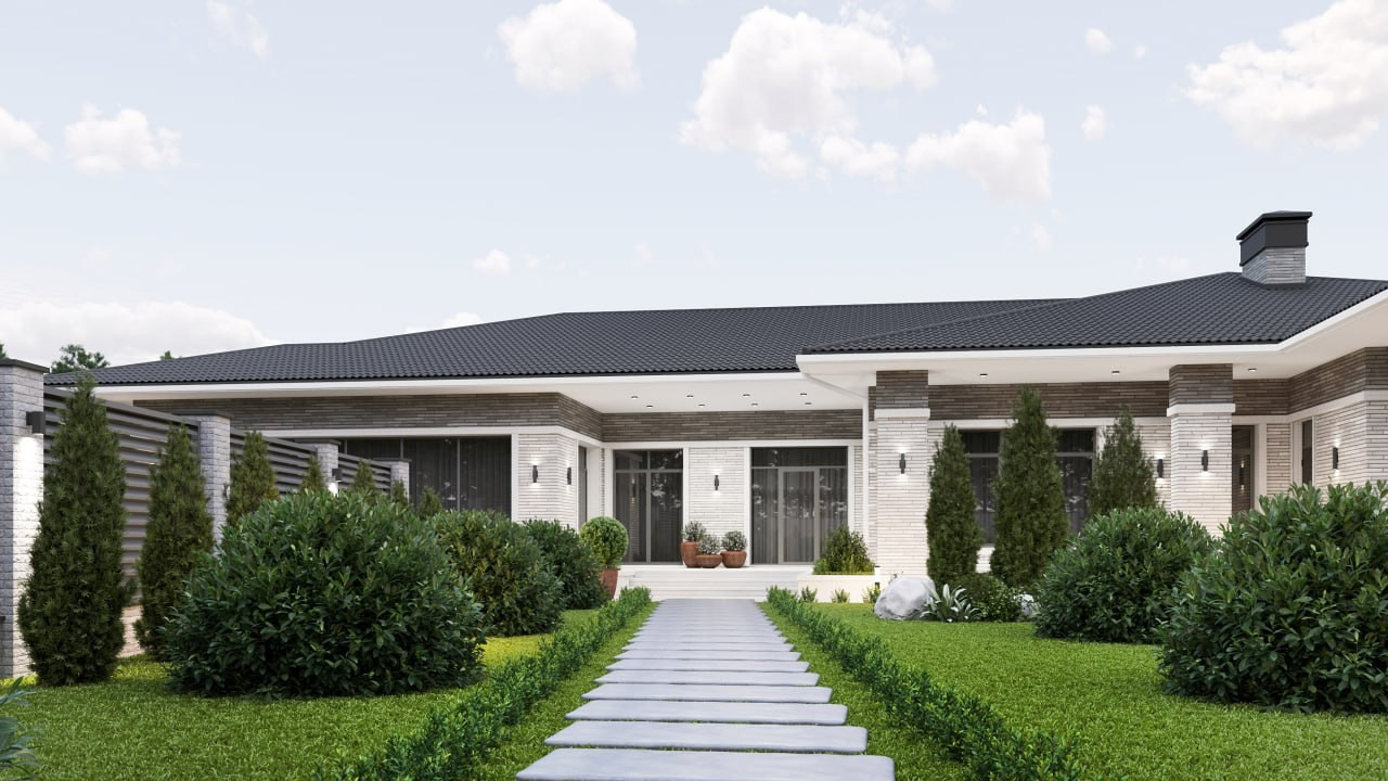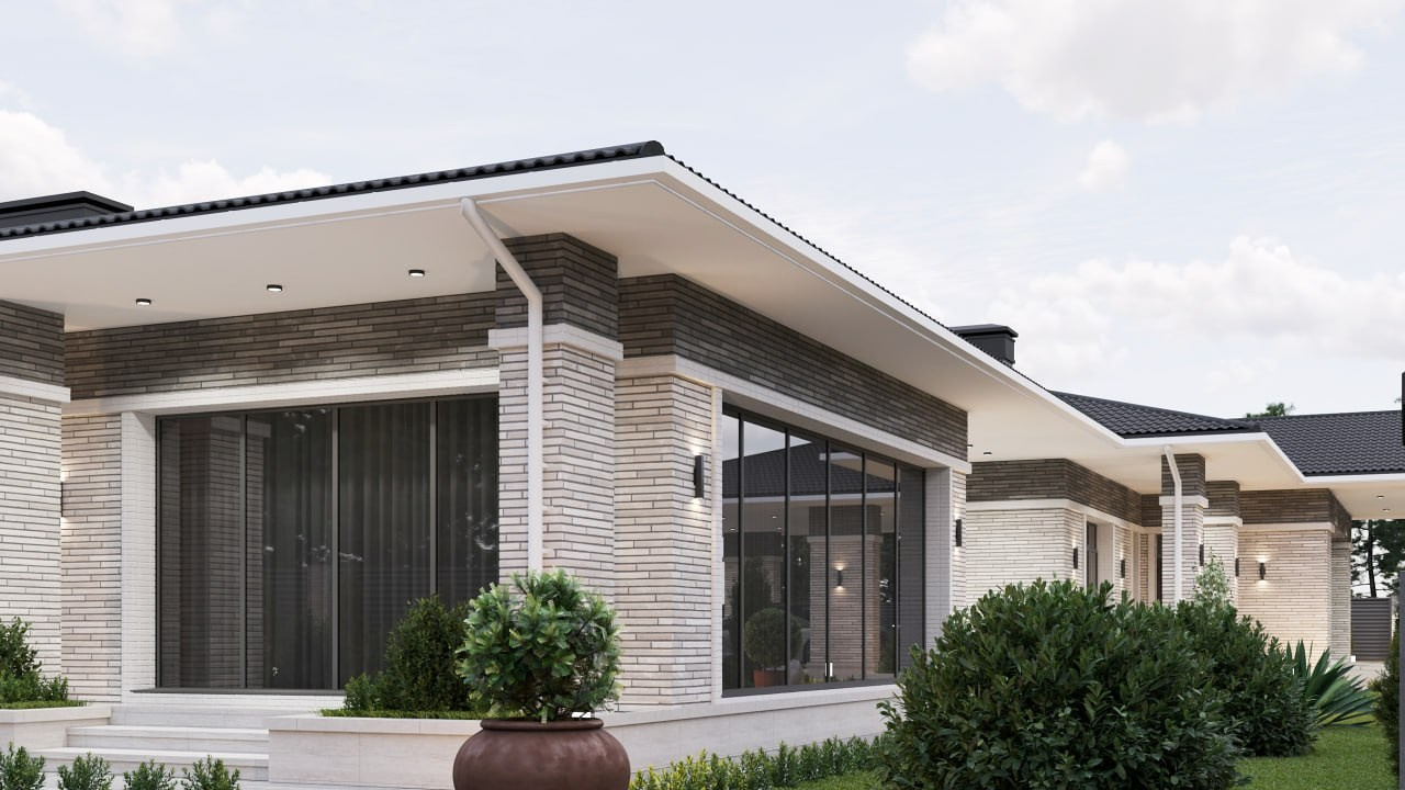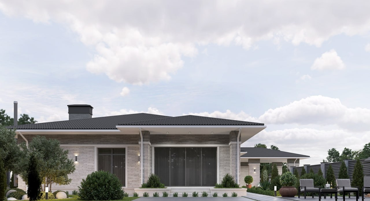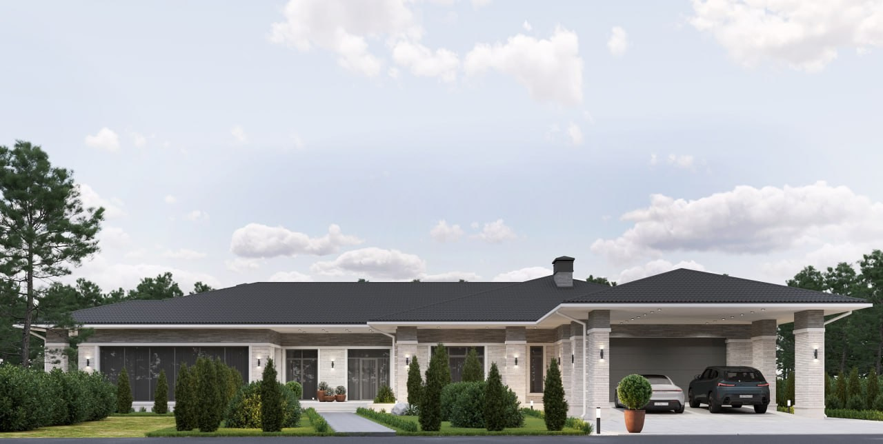 Проект дома с большими витражными окнами для ценителей изящных линий и современного дизайна.